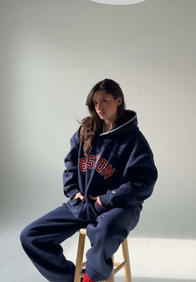 If you’re new here: Home of Champions (HOC) celebrates the 40+ championships Boston has claimed through the Celtics, Bruins, Red Sox, and Patriots. It was Sarah’s concept (our CGO and my co-owner—together we own 100% of 1987) that she pitched almost two years ago. The line took off right away, but this past year the energy has been next-level—especially after our viral navy HOC hoodie. We STILL get DMs about it eight months later. And yes, good news: it’s coming back this fall, both in the original design and in a slightly updated version with fresh details. If you’ve been in our comments begging for it—we heard you.